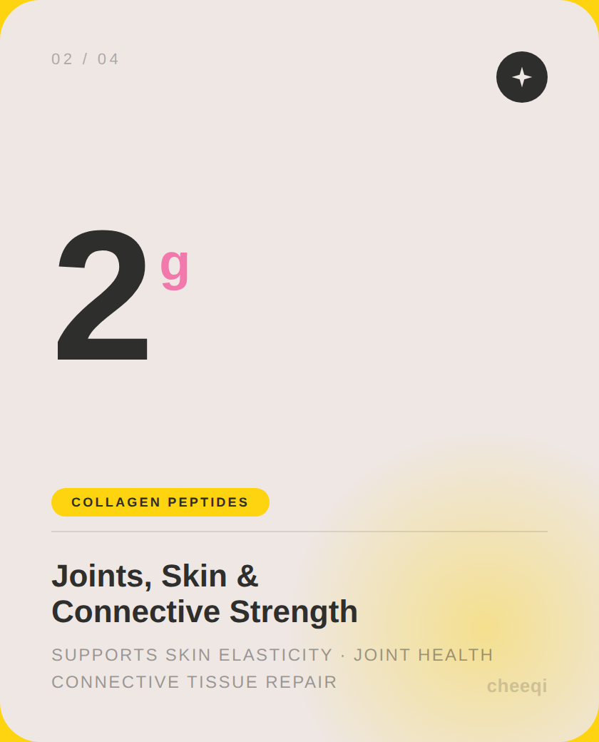 Cheeqi Core isn't about stacking capsules or counting pills. It's a single, precisely dosed daily serving — formulated so each ingredient amplifies the next. No fillers. No fluff. Just what your body actually needs to perform.