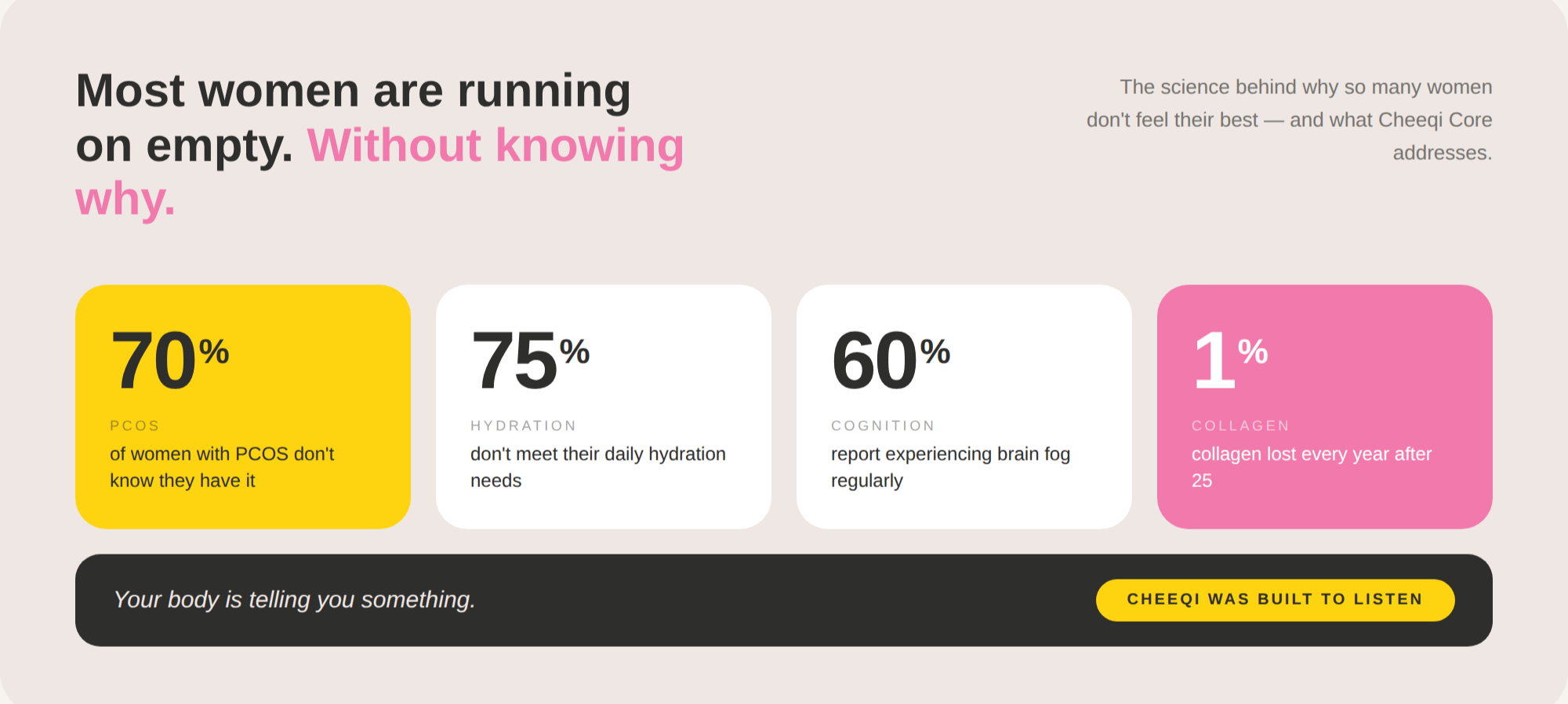 You're not imagining it. And you're not alone. Most women are navigating real hormonal, cognitive and hydration gaps without the right daily support. Cheeqi was designed to change that — quietly, consistently, every single day.